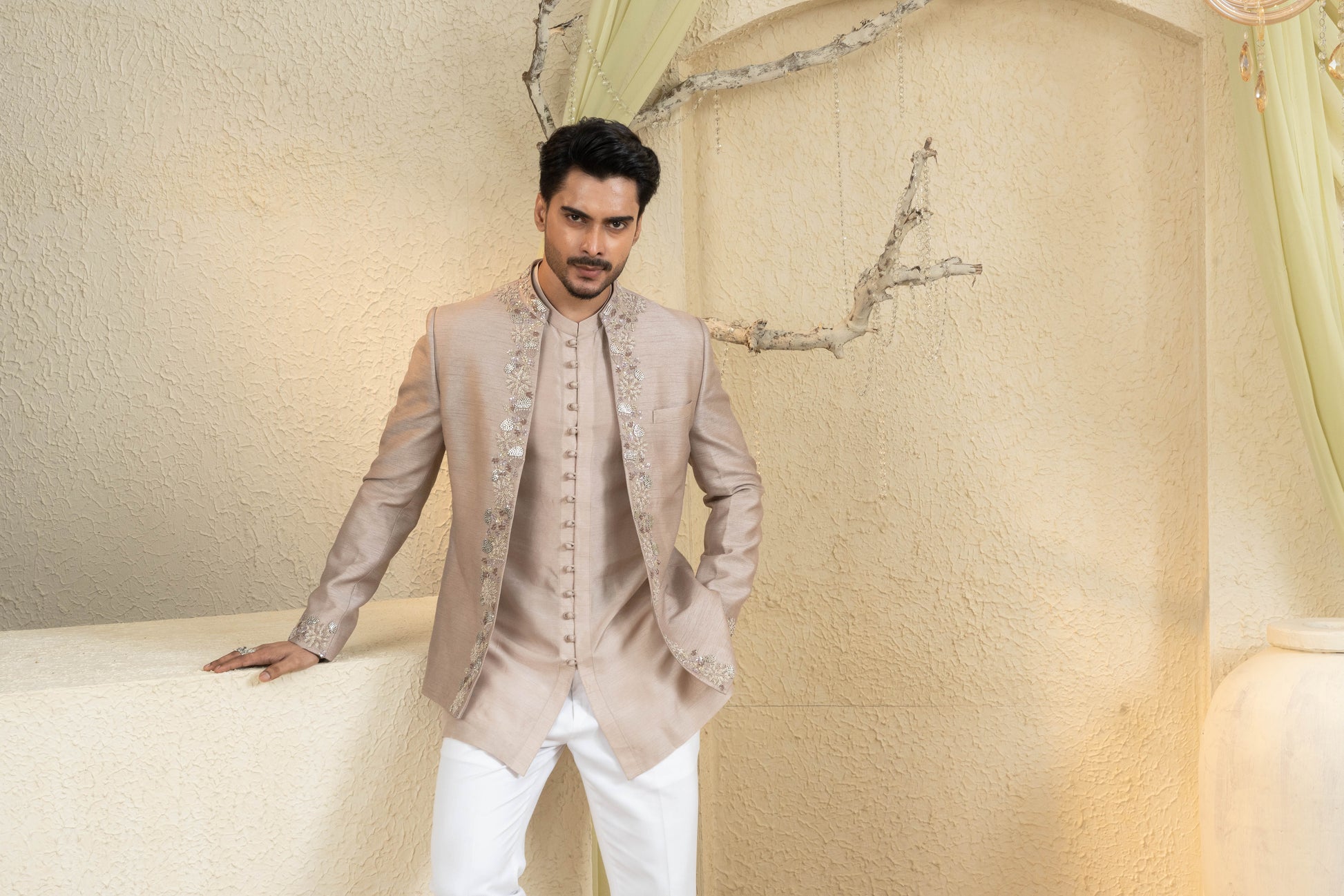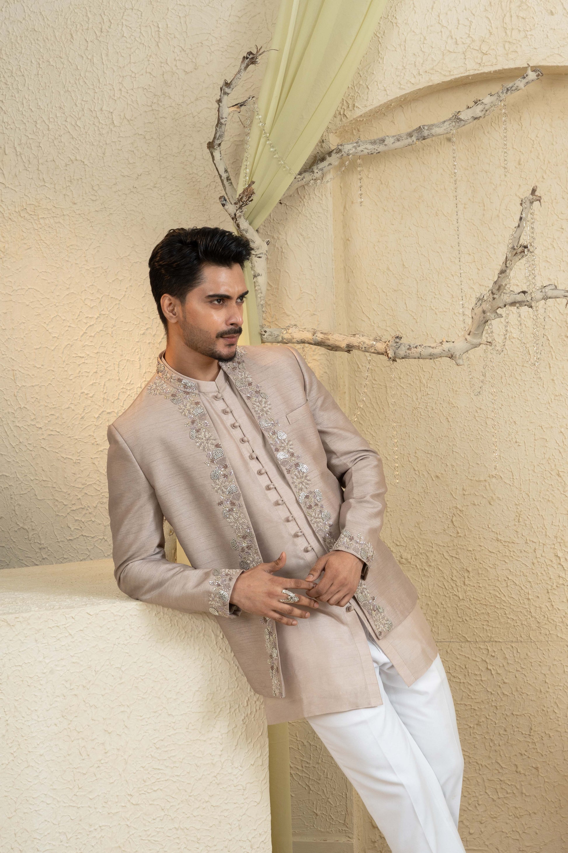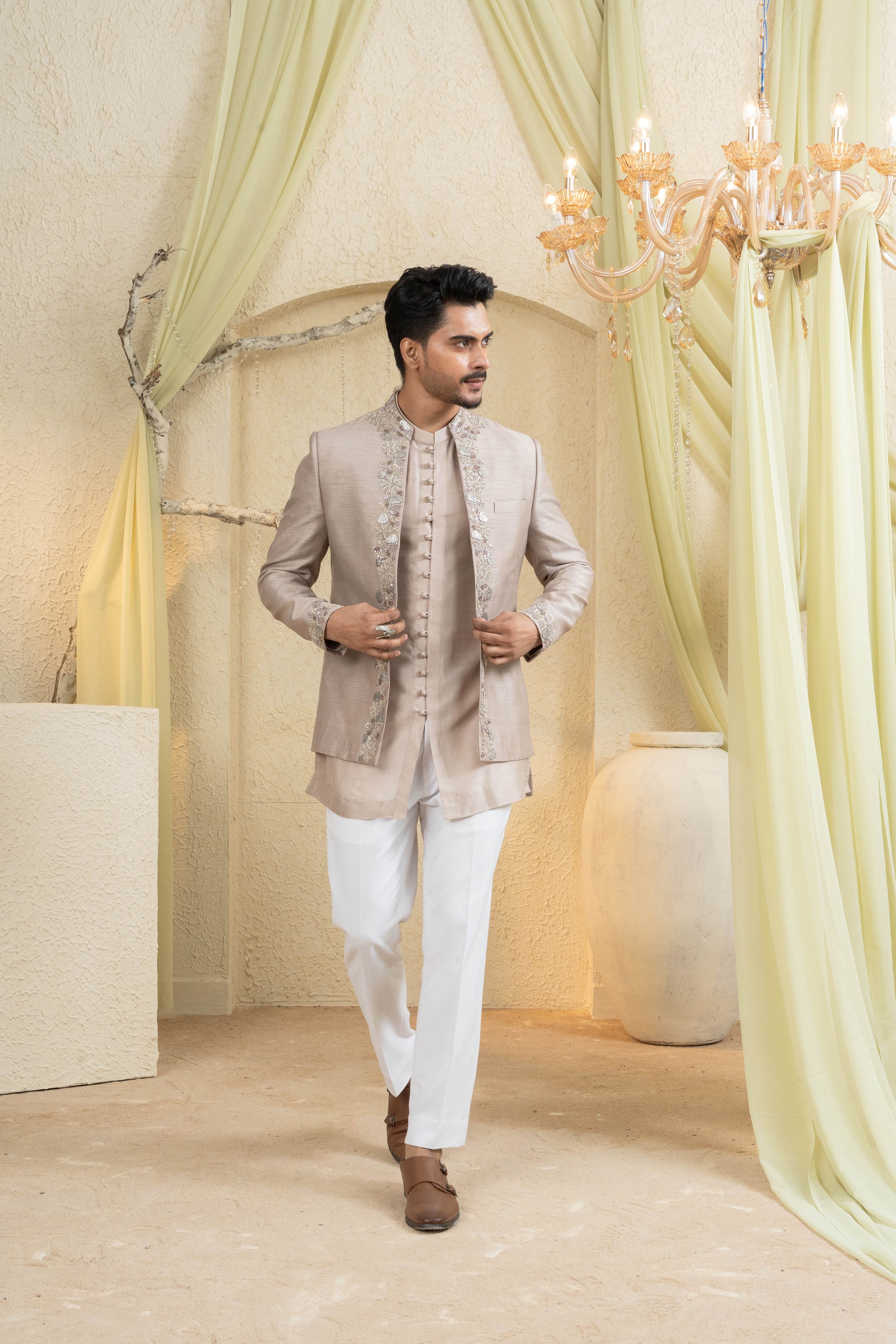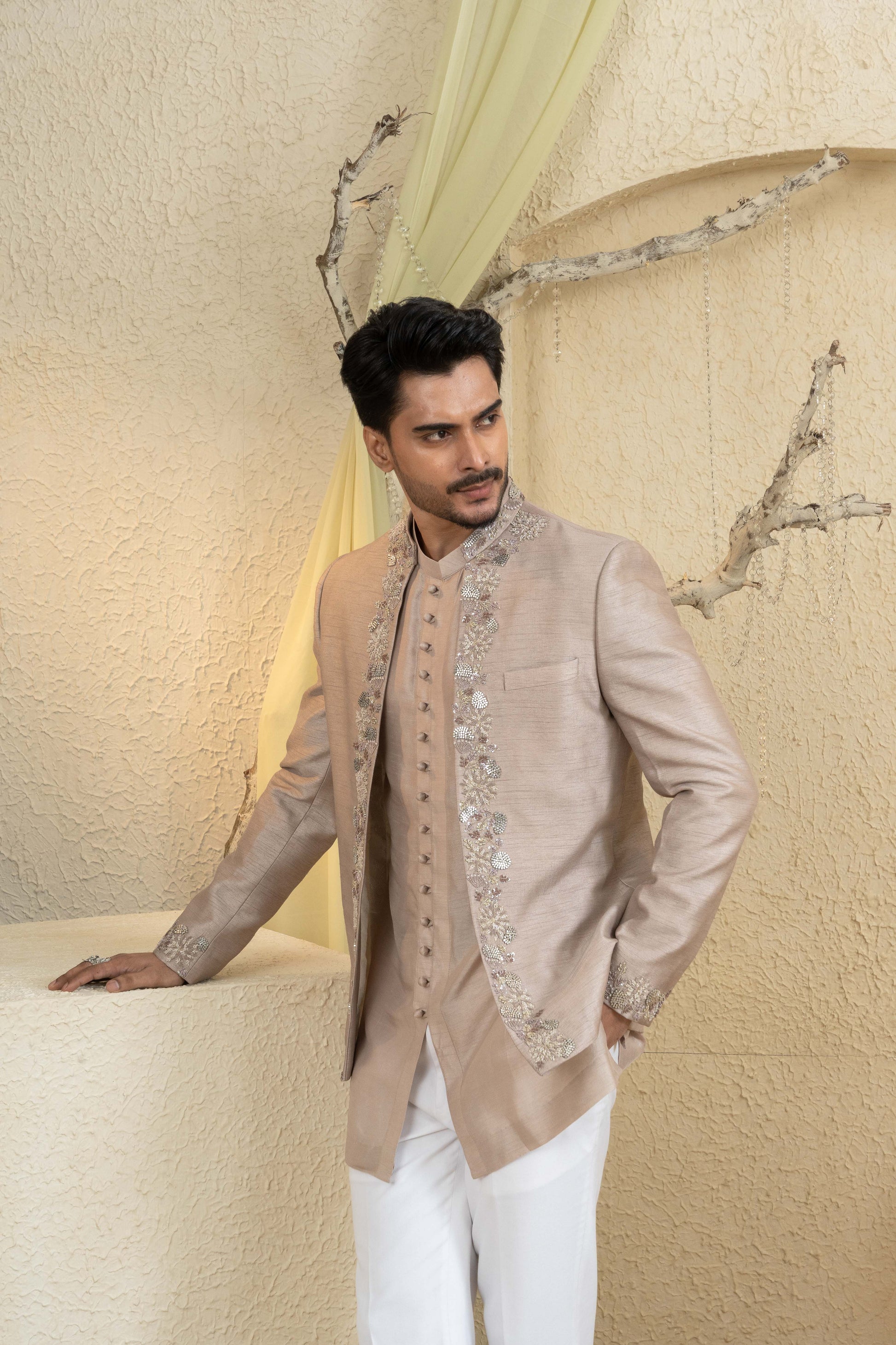 The Champagne Gold Embroidered Jacket Set exudes poised refinement with intricate hand-embroidery across a structured longline jacket. Styled over a clean kurta and tapered trousers, it creates a sleek ceremonial profile with subtle shimmer and balanced proportions. A polished choice for receptions and festive gatherings, offering elegance and ease in the Champagne Gold palette.
