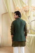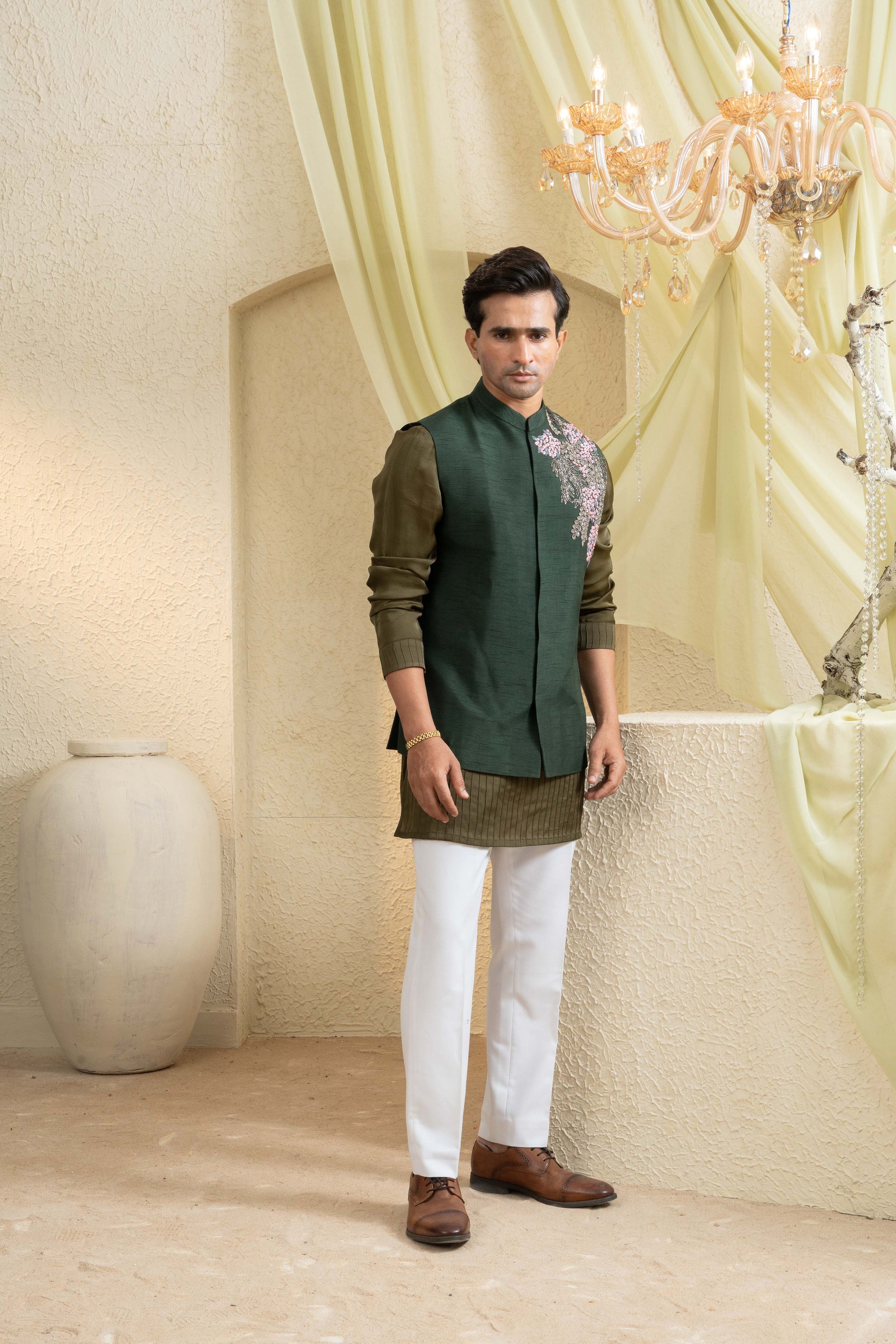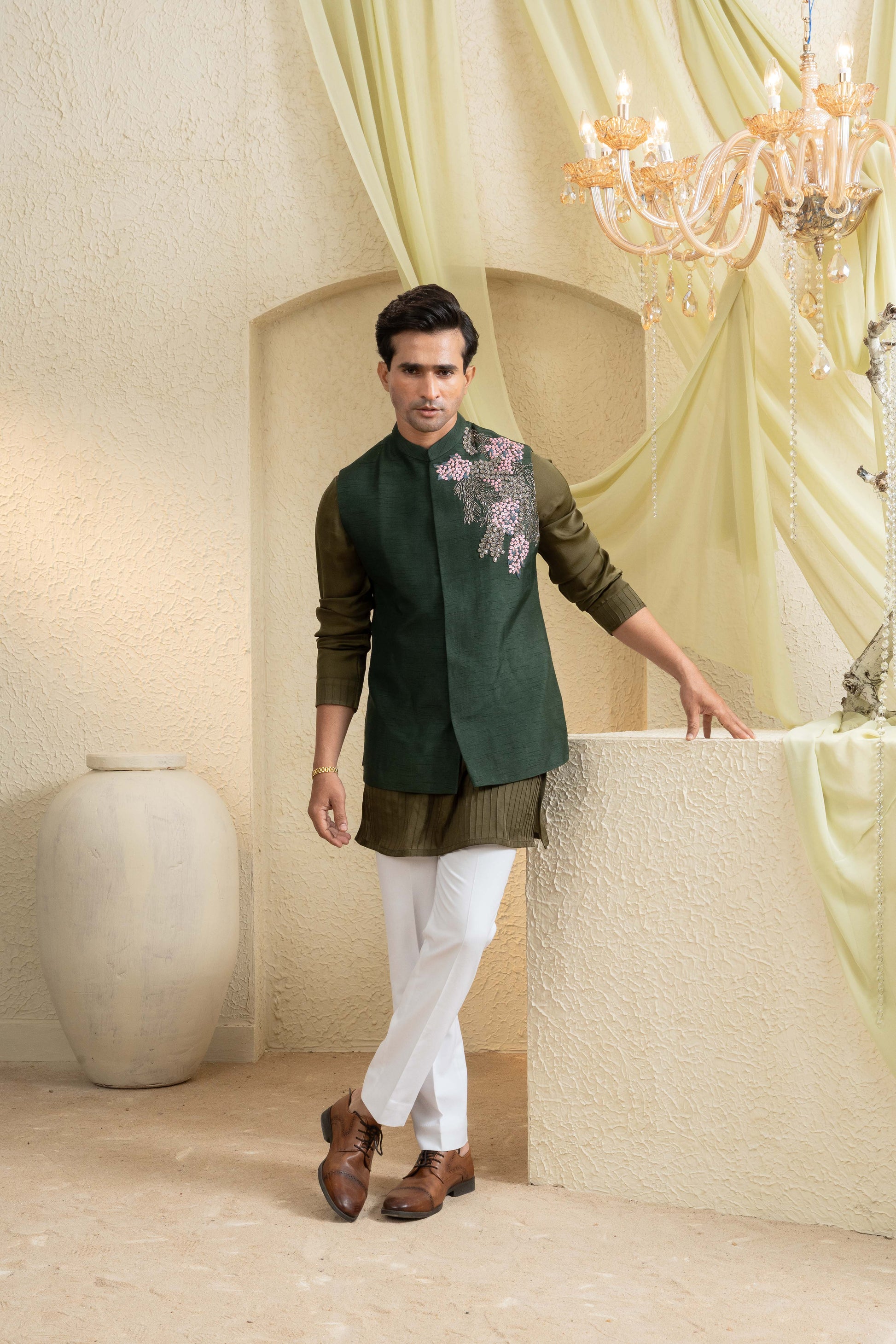 Impeccably tailored in forest olive, this Bundi set is adorned with intricate hand embroidery that sweeps across the shoulder, creating a refined focal point. Paired with a crisp kurta and tapered trousers, it offers a distinguished balance of tradition and modern polish for celebratory dressing.
