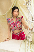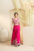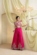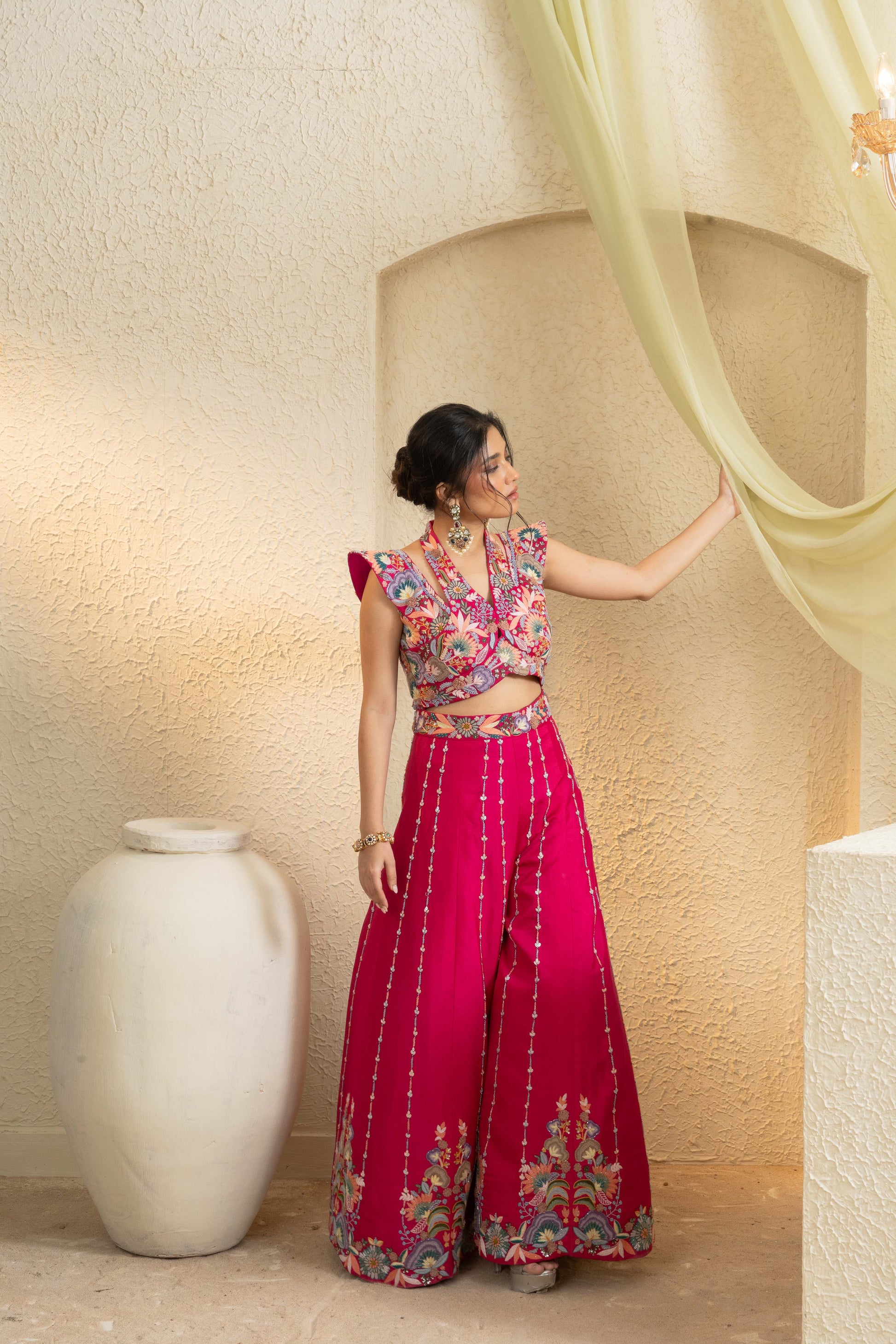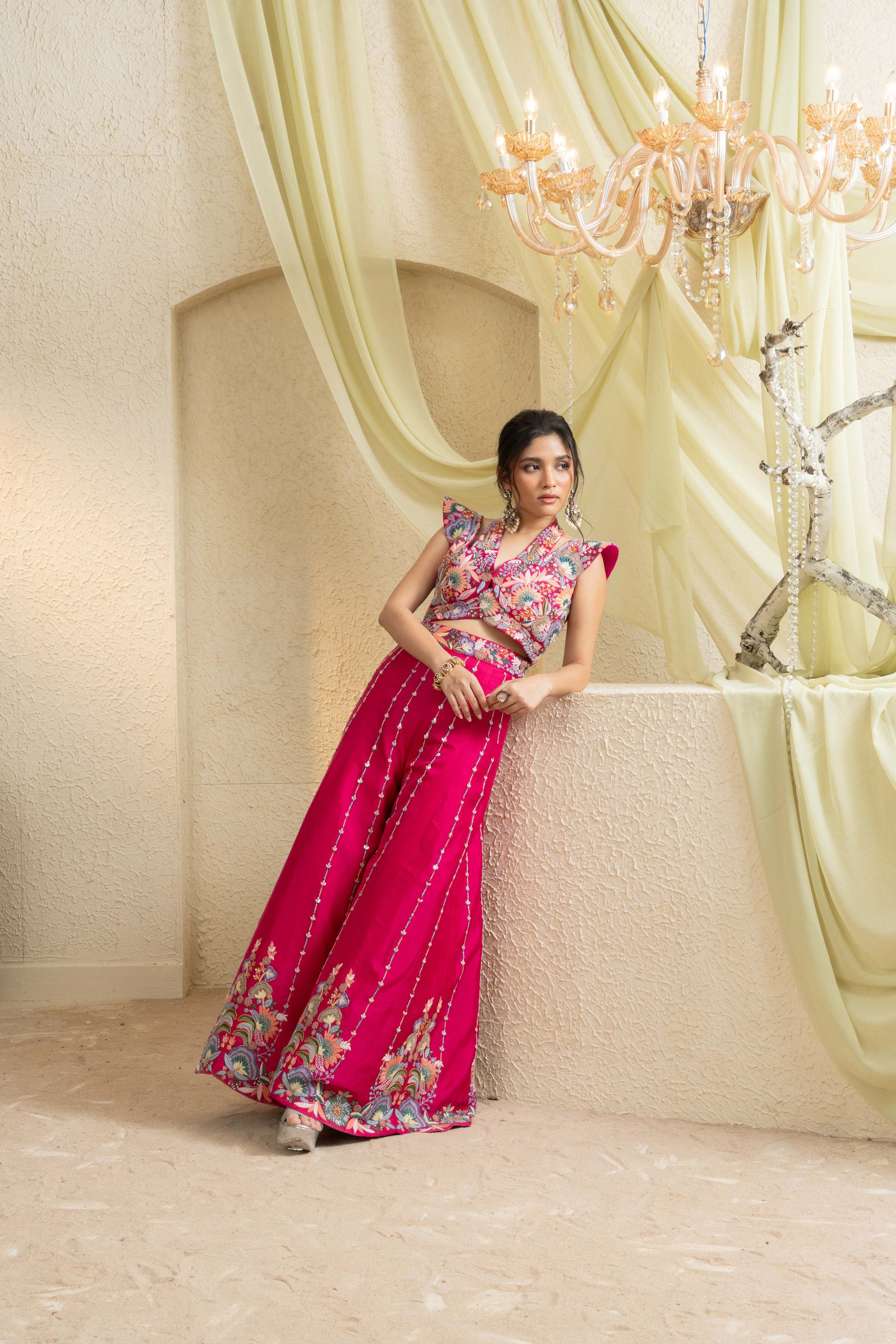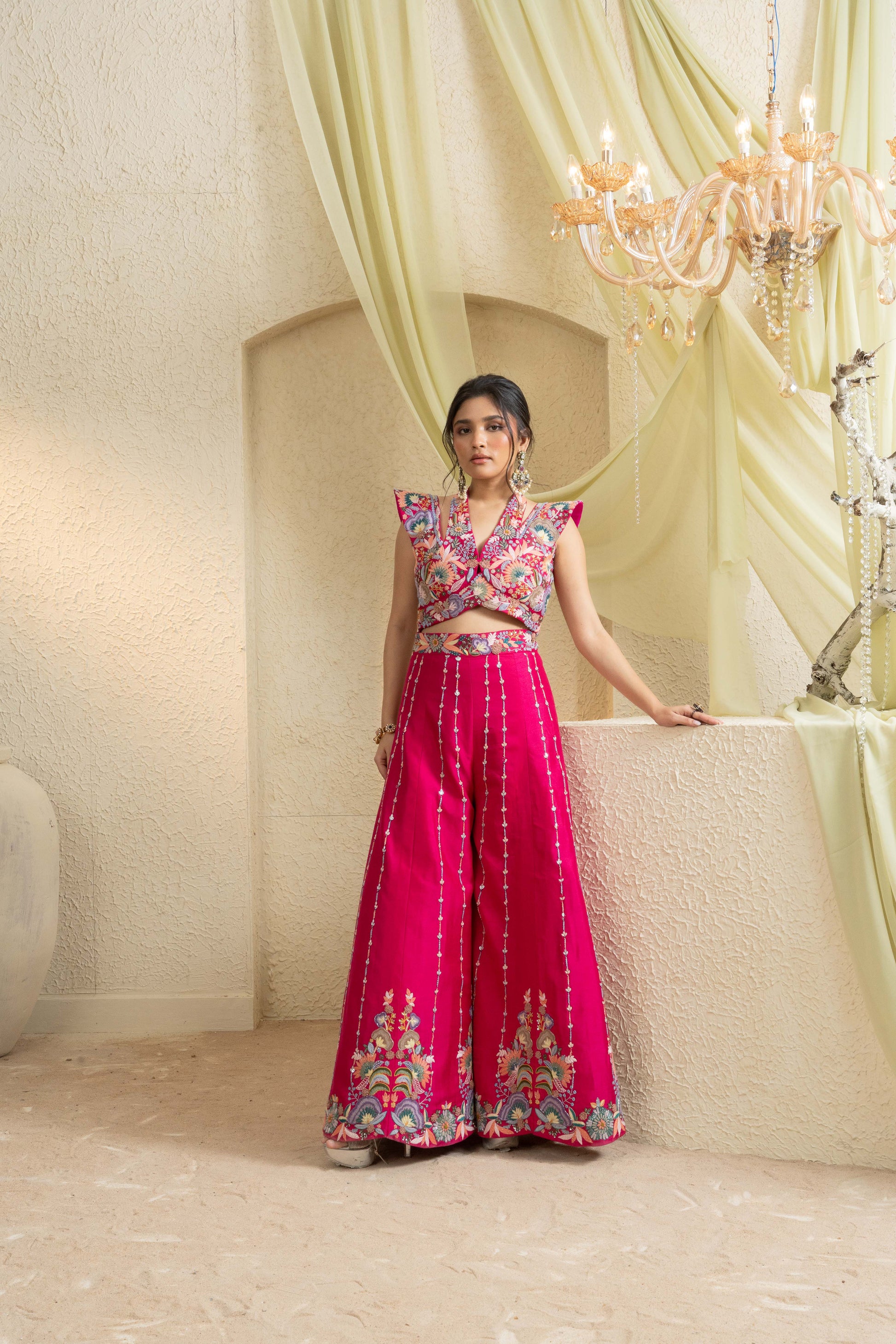 Vivid and arresting, this jumpsuit blooms in radiant fuchsia, adorned with intricate hand embroidery that dances across the bodice and hem. The wide-legged silhouette moves with graceful ease, while the vibrant palette and detailed craftsmanship create an ensemble that is both playful and regal.