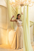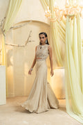 The Luxe Beige Hand-Embroidered Jumpsuit is a statement in contemporary elegance, featuring intricate embroidery on the bodice and a fluid wide-leg silhouette. Its refined design blends sophistication with ease, making it a perfect choice for both day celebrations and evening soirées.