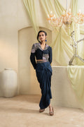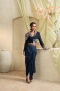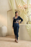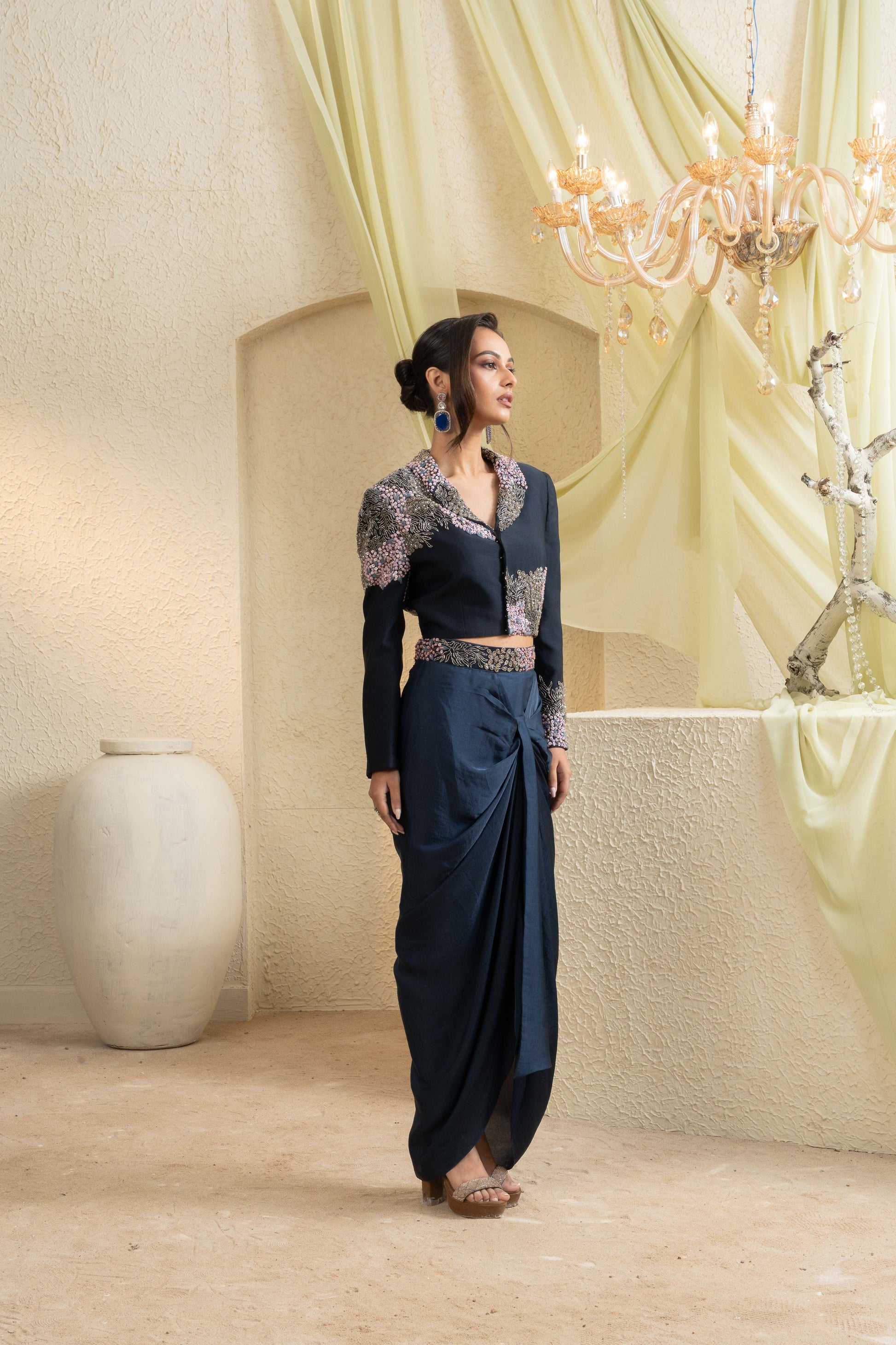 An elegant Midnight Hand-Embroidered Jacket Set crafted for refined evening dressing. The tailored jacket showcases meticulous embroidery that adds depth and sophistication, paired seamlessly with sleek bottoms for a modern yet timeless silhouette. The rich midnight tone exudes understated luxury, making it perfect for cocktail nights, receptions, and festive occasions.