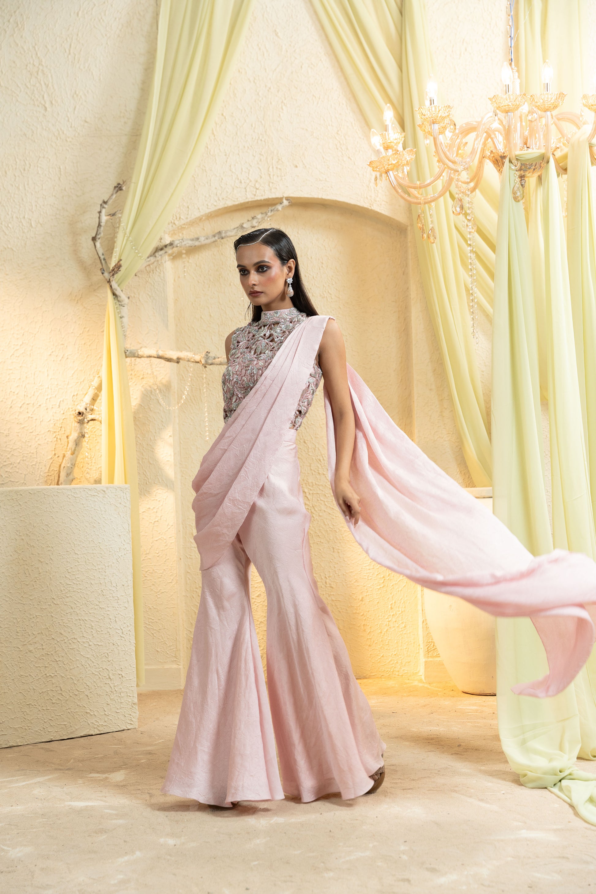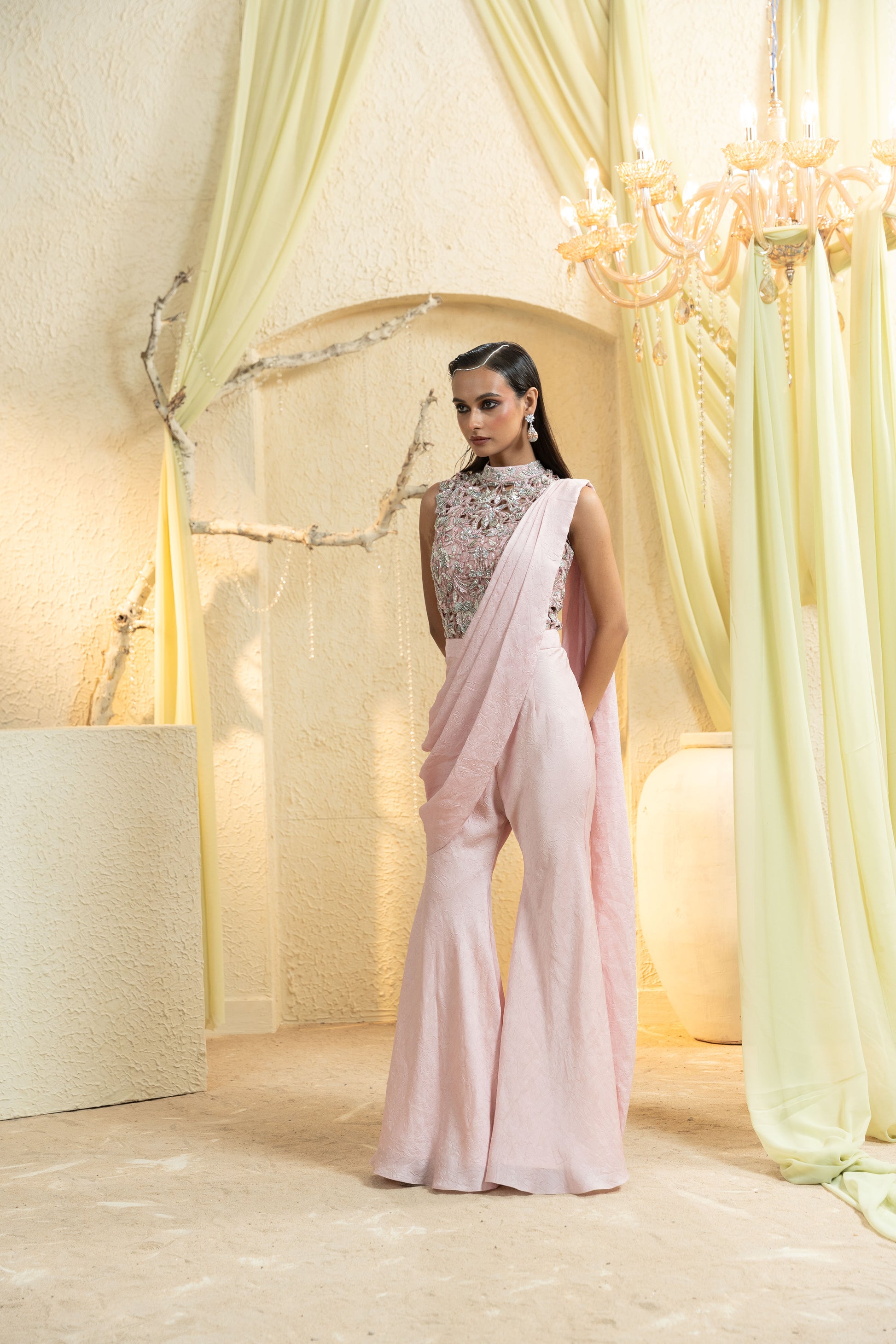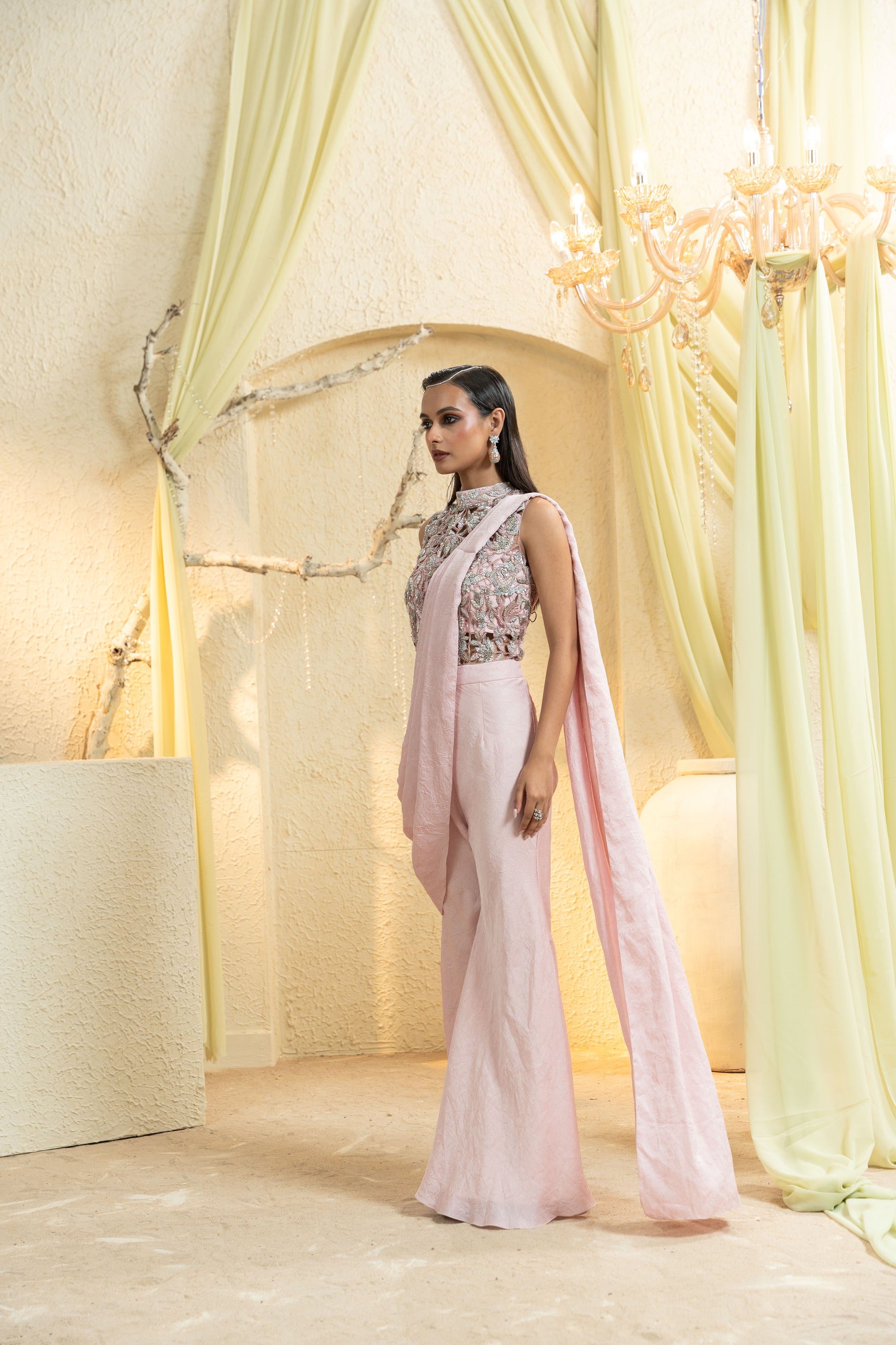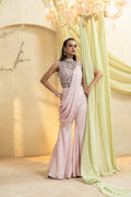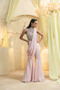 An elegant Muted Rose Hand-Embroidered Pant Saree that pairs an intricately hand-embroidered blouse with a contemporary draped saree panel over tailored pants. Soft pleats sculpt the waist and elongate the frame, while the muted rose palette keeps the look refined and modern—ideal for cocktail receptions, sangeets, and festive evenings.