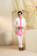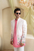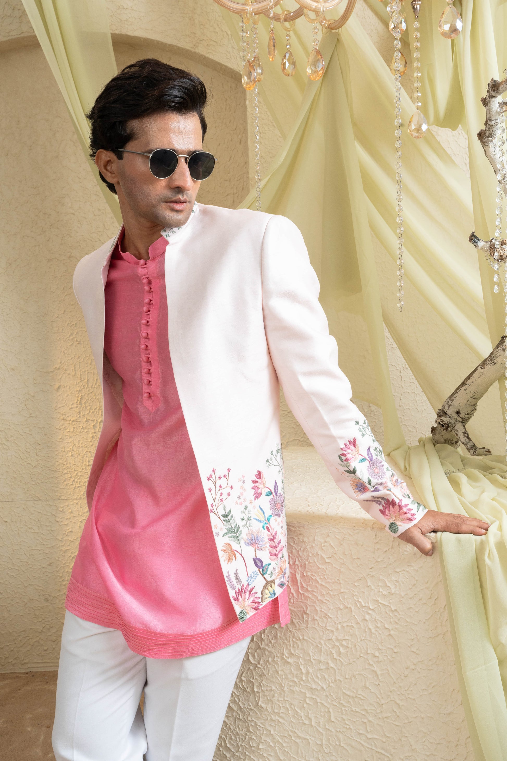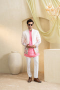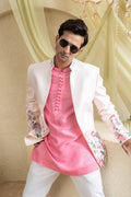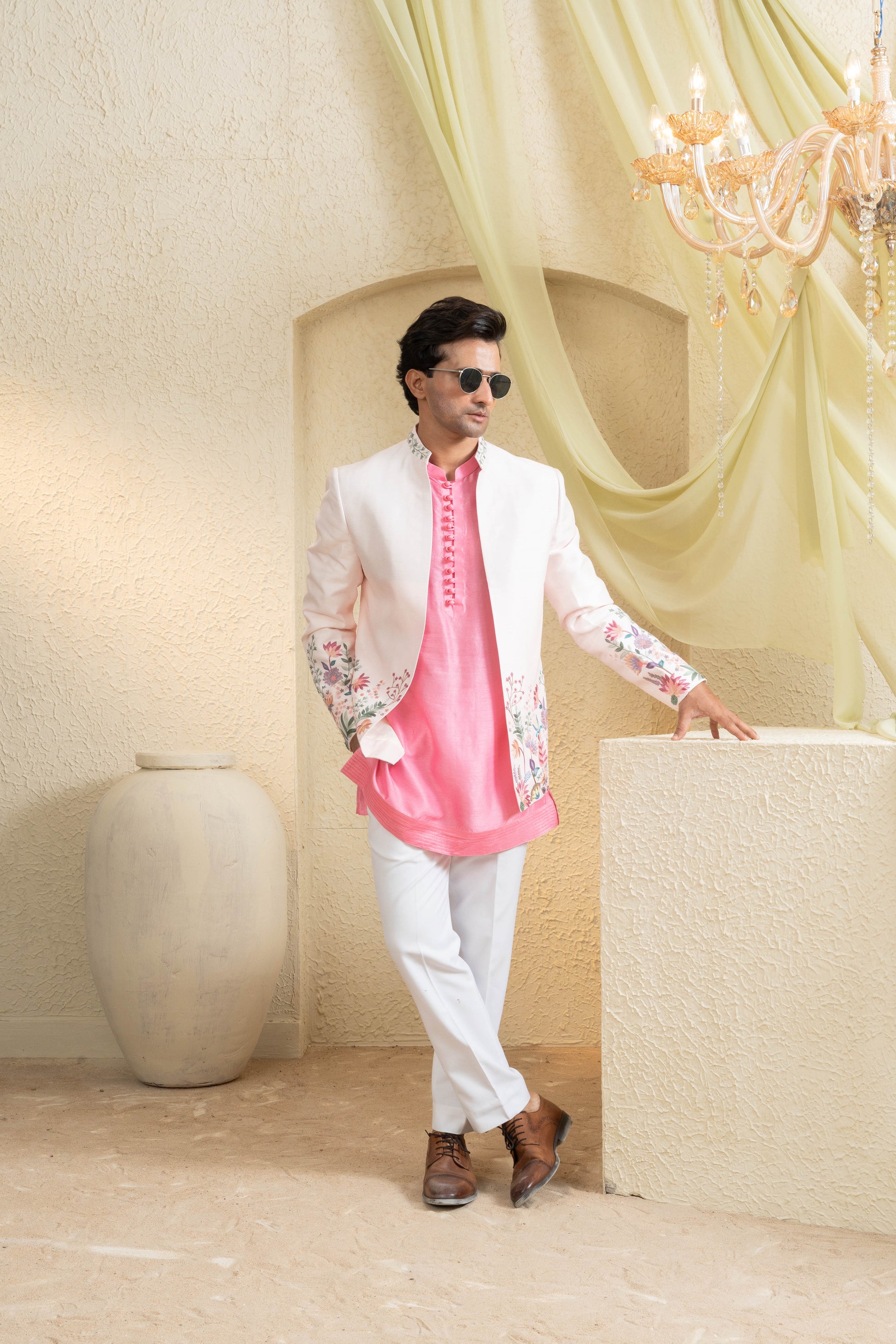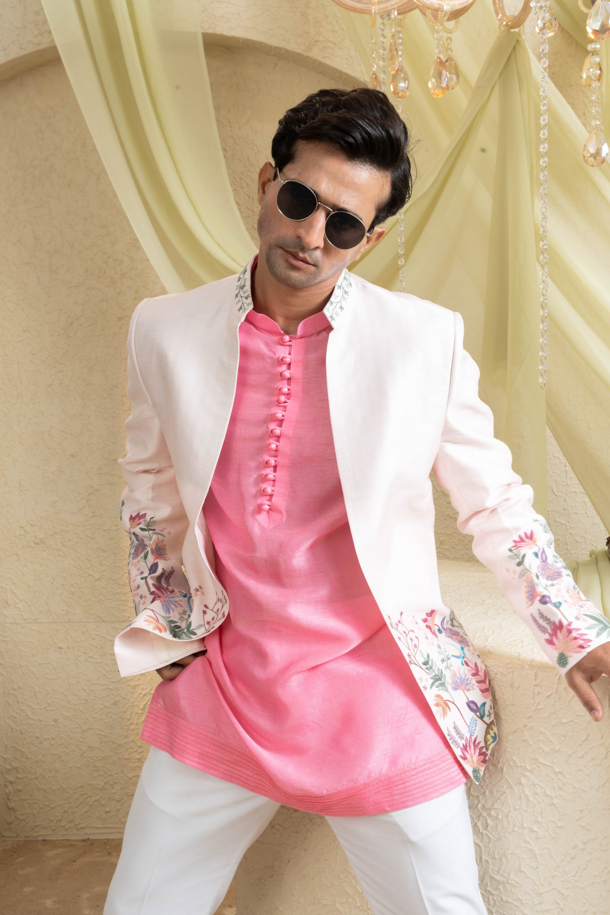 Elegant and understated, this Powder Blush jacket set is designed as part of the Roslyn embroidery story, twinning seamlessly with the coordinating womenswear ensembles. The crisp tailoring is balanced with subtle embroidered accents, paired with a pastel kurta and tapered trousers to create a harmonious look for coordinated celebrations.
