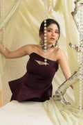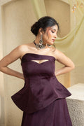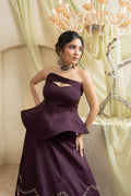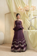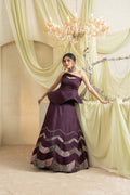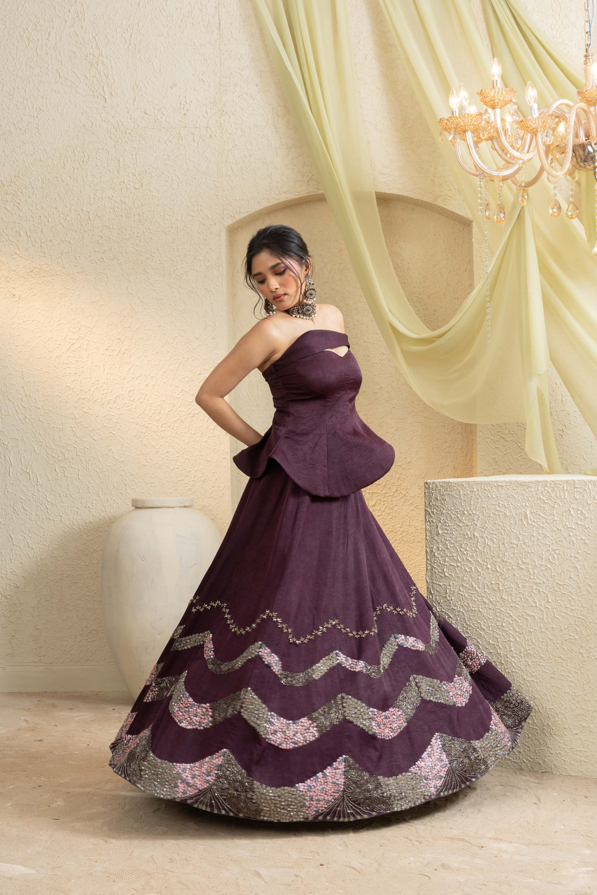Elegant in form and colour, this smoky wine lehenga is adorned with intricate hand embroidery that flows in graceful patterns across its expanse. The sculpted peplum-style blouse offers a clean, structured contrast, bringing a modern edge to the ensemble’s timeless artistry.